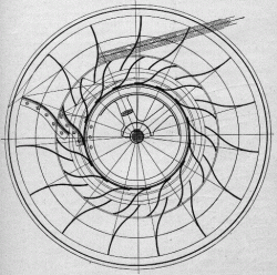 The principle of the Archimedian screw can also be utilized to win mechanical energy. Often, the idea is attributed to Giovanni Branca, who described 1629 a predecessor of today's water turbines. In fact, Leonardo da Vinci made the same suggestion already around 1490. He used the principle for a perpetual motion machine! |