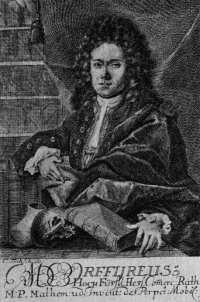 This gentleman is Johann Ernst Elias Bessler (1680-1745). With his artist's name Orffyreus he made carreer and wrote a chapter in the history of technology. Bessler was an universally skilled, but unsteady man who rarely kept continuing a work for a longer period of of time, thus frequently lacking money. But Bessler was intelligent, learned quickly and he was an eloquent speaker. So he understood quite well to get his advantages out of every situation. At a time, when German rulers used to employ court's mechanicians and alchemists (often with the intention to fill their own purse), Bessler attracted attention in 1715 as he presented an apparently working perpetual motion machine to the public. In 1716, Landgrave Karl of Hessen-Kassel got interested in the machine, and the German mathematician and philosopher Leibniz recommended to invite Bessler, who followed the invitation. Landgrave Karl provided a large room in his Weissenstein castle where Bessler built a larger sample of his machine and set it into motion. The room was closed and the doors sealed. As it was re-opened after a fourty-day period, the machine still kept running at unchanged speed. |