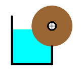 Even simpler is the next device. A wooden wheel is at one side only partially immersed in a water tank. The asymmetric buoyancy force was supposed to keep the wheel rotating. The inventor of this machine did not take in account that pressure in liquids always acts from all sides and exerts forces perpendicularily on the surface of the submerged object. This is a common misunderstanding about the way upward buoyant forces are generated. The wooden wheel proved to be a perpetuum stabile, which is not surprising at all.