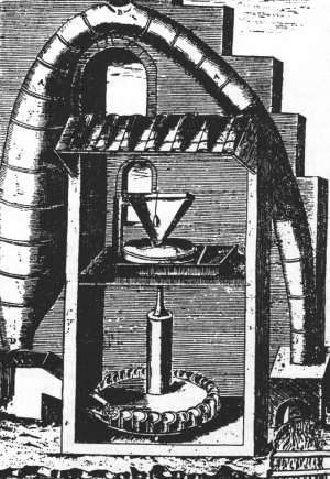 Based on ideas of Giovanni Battista della Porta (1535-1615), the italian renaissance engineer Vittorio Zonca (1568? - 15 Nov 1602) invented a PM that used the effect of the siphon. Siphons only work when the outlet opening is lower than the inlet. At Zonca's time this fact was not correctly known which made the construction seem to be a realistic option to obtain a perpetual energy source. Look at the strange belly shape of the siphon! It is not caused by poor skills of the draftsman, but by the idea, that a larger cross-section at the outlet will compensate the lack of height. The whole idea seemed plausible, as the siphon effect was not explained by air pressure but by the aristotelian horror vacui. I.e. nature "abhors a vacuum", meaning "nature cannot produce a vacuum."
