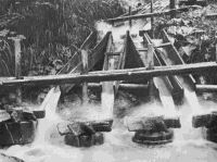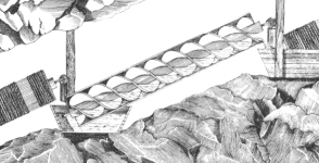 In places were swiftly running water is abundant, even primitive turbines survived until the twentieth century like these in the austrian Alps. Their efficiency is bad, but sufficient enough for the purpose, which in this case is grinding of marbles. |