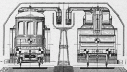 which are around 55hp. Compared with the several thousand hp, a standard locomotive provides, this seems to be a rather poor result. But stop! What about the dynamics? If the locomotive runs along the upper canal, the water is forced into the guiding tube to the turbine. Moreover, the siphon effect should add power.