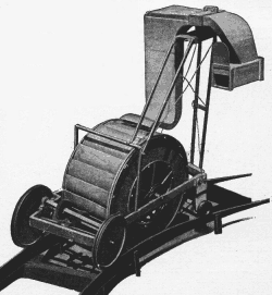 The hydrovolve engine is a german invention which is no PMM at all, but an interesting technical concept with interesting flaws. The principle is based on an overshot waterwheel which powers a locomotive. The wheel is fed by an overhead canal which runs parallel to the railway tracks.
