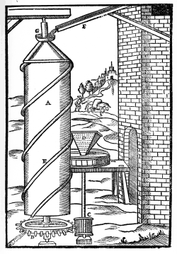 The principle of the Archimedian screw can also be utilized to win mechanical energy. Often, the idea is attributed to Giovanni Branca, who described 1629 a predecessor of today's water turbines. In fact, Leonardo da Vinci made the same suggestion already around 1490. He used the principle for a perpetual motion machine! |