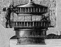 This type of water wheel with vertical axis dates back to the end of the sixteenth century. The earliest design I could figure out is this one by Giovanni Branca. The construction element was used by Jacopo Strada for a recirculation mill which thus became the first PMM with a water turbine. Later, Andreas Boeckler recycled the idea in the mid-seventeenth century. |