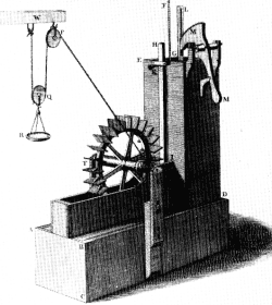 Water wheels are a class of old machines which were developed since 2000 years. The first account of a water wheel combined with a bucket chain was given by Philon of Byzanz.