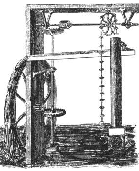 This recirculation mill combines an overshot water wheel with a pump,
