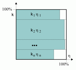Mathematicians will have few difficulties to see why the total is not more than 1. Those who want a more obvious demonstration should look at the next diagram. One axis represents the total energy, split into fractions k1 to kn. The other axis represents the efficiencies h1 to hn.