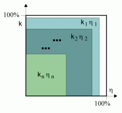 The total energy fed into the system is the input energy applied with an efficiency of 100%. The sum of the resulting partial efficiencies ki.hi is represented by rectangles of appropriate size. Can these sum up to more than the size of the enclosing square? |