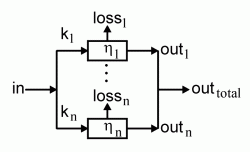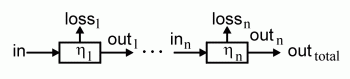 The first machine element will work with efficiency h1. Thus, the output energy delivered to the next element is less or equal to the input energy of the first element. The total energy that is delivered to the output of n stages of this type can be calculated by the product of efficiencies hi of the single elements. |